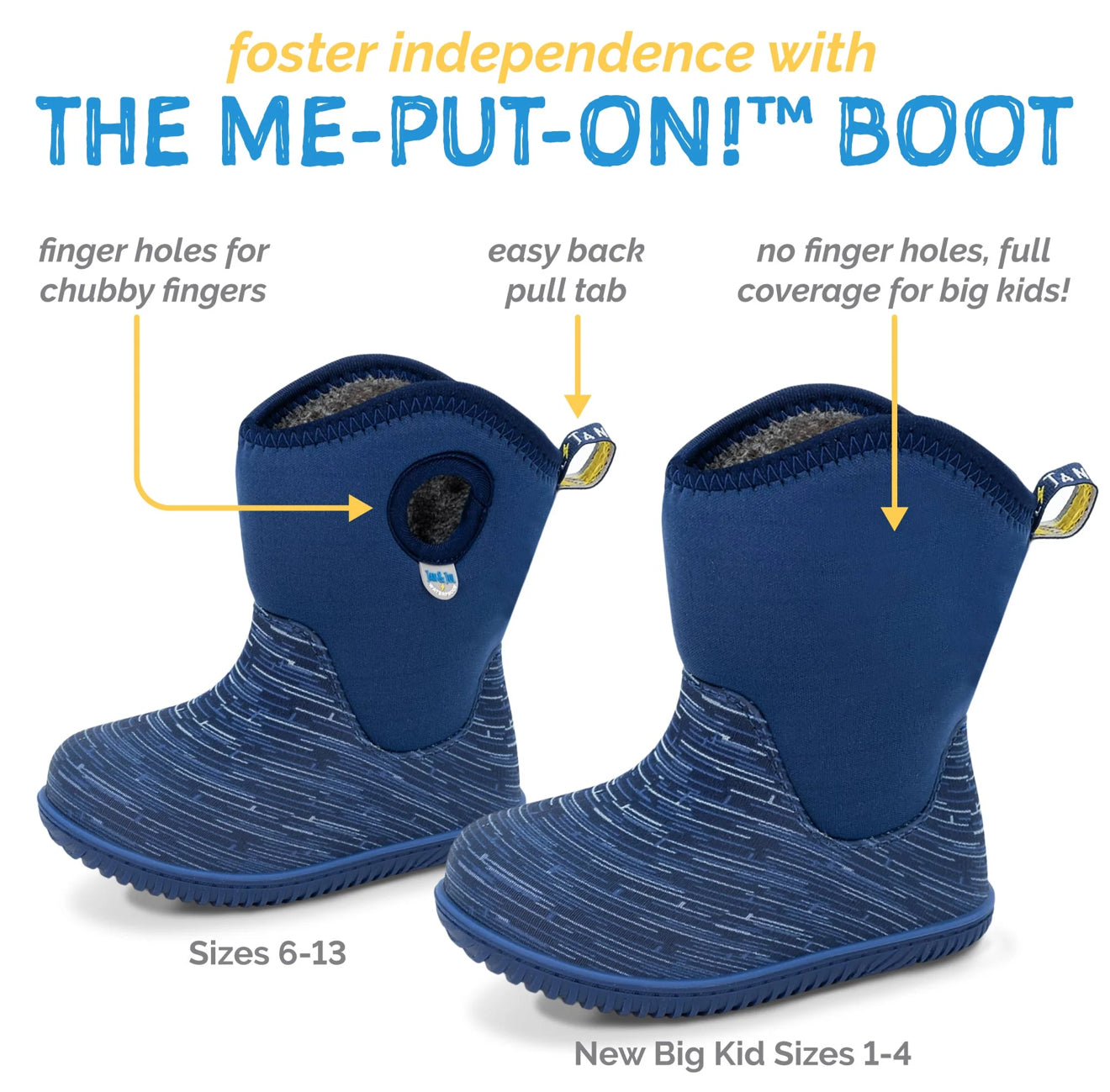 - Me-Put-On™: Easy-on with back pull tab. Toddler and Little Kid sizes feature simple finger holes.